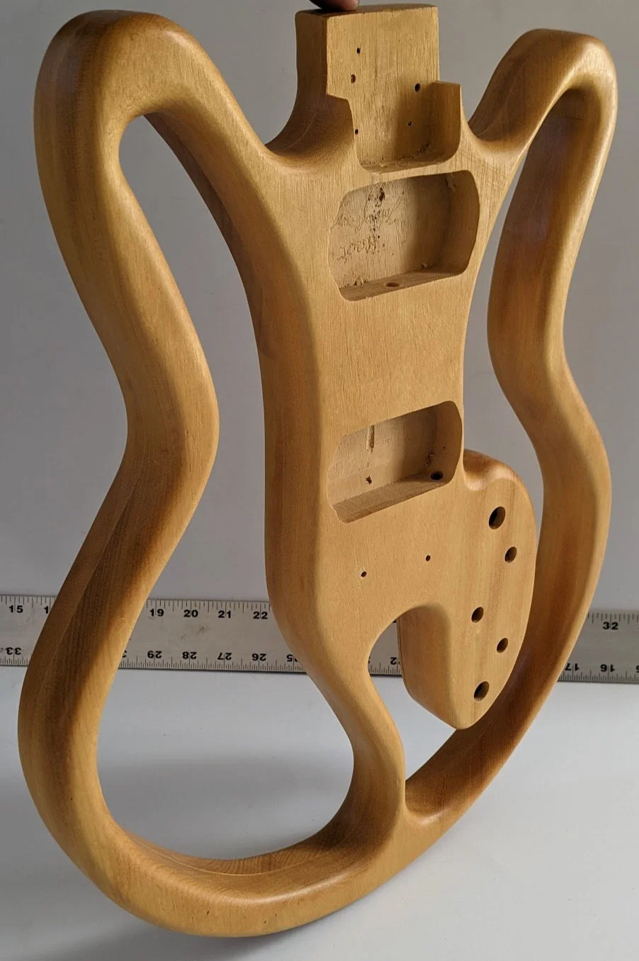 This is an incredible custom built, hand-made electric guitar body like we've never seen before. It's truly a piece of art. Routing has been drilled for the pickups and the neck. Holes have been drilled for the neck, bridge, tone & volume knobs. Rear routing has also been completed. This body is in very good condition (see photos), and is great for your own DIY or kit build project. The body in the photos is the product you will receive. Weight is 3lbs 15oz. Stands 18" tall, 14" wide, and 1.75" thick. You won't find something like this anywhere else!